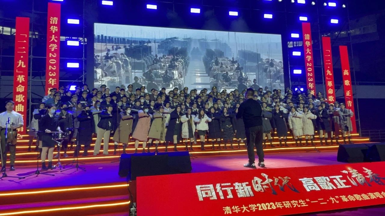 当晚七点,“同行新时代 高歌正清春”2023年研究生“一二·九”革命歌曲演唱会于综合体育馆内正式开始。