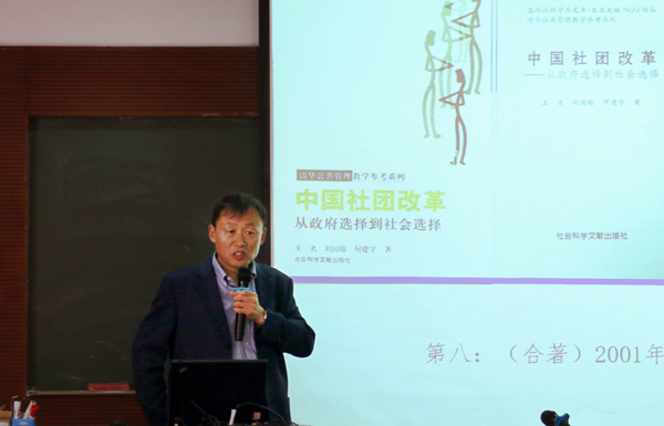 首位主讲人是王名老师。2013年对王老师而言是多产的一年,他先后出版了《建言者说》、《社会组织论纲》等著作。但在此次真人图书沙龙活动上,王老师并未拘泥于近两年的几本著作,而是以《著作与人生》为题分享了他近30年的学术之路。他将自己的这段人生路命名为“从青涩到成熟的27年”,他从1987年第一本译著《经济人类学》开始讲起,到自己的第一本著作《时代新论》,到第一本教材《非营利组织管理概论》,再到近两年的诸多著作,“27年27本书”王老师自己概括道。他同时还简单描绘了未来几年的研究和写作计划,给同学们带来了学术的新思想。王老师将他的学术奋斗经历和经验与自己体悟到的人生哲理编织在一起娓娓道来,引发了现场同学们和参与者的阵阵掌声。